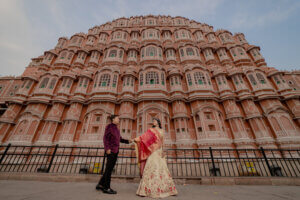 Couple posing in front of the iconic Hawa Mahal in Jaipur during their pre-wedding shoot.